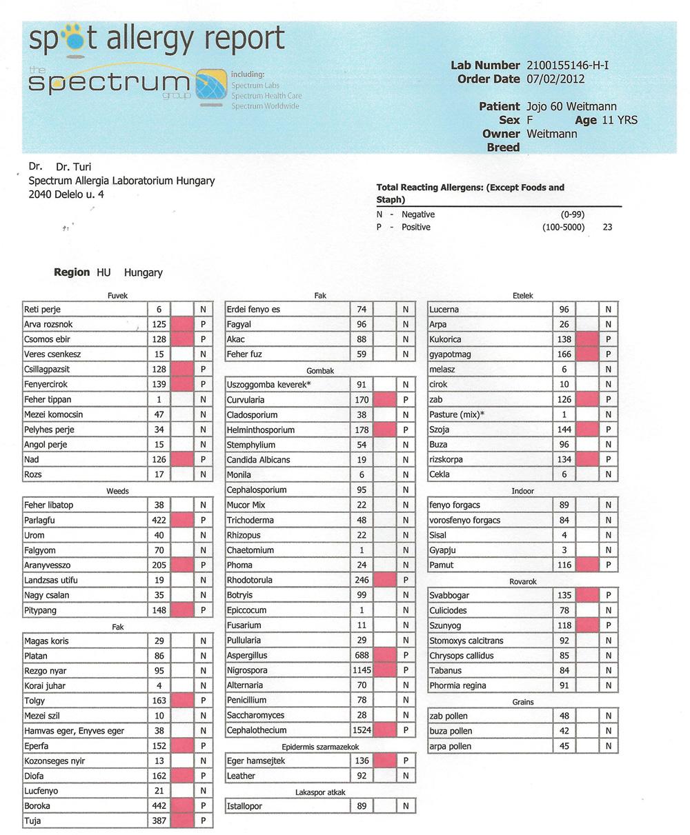 A Spectrum Worldwide Inc. (www.vetallergy.com) , a világ egyik legnagyobb állatorvosi allergia laboratóriuma ( Magyarországi képviselet: Spectrum Allergia Laboratórium, Budaörs Patkó u. 9, Dr. Szaniszló Ferenc) az eddig is jól teljesítő SPOT allergia vizsgálati eljárást korszerűsítette, és SPOT PLATINUM néven 2013-tól bevezette a kutyák, macskák és lovak allergia diagnosztikájában. A SPOT PLATINUM teszt monoklonális ellenanyagokkal végzett allergen specifikus IgE kimutatáson alapszik, de kiegészítve számos ún. "zajcsökkentő" eljárással (nem allergén-specifikus IgE eliminálás, allergén-specifikus IgG és IgM eliminálás stb.), ami miatt az ismert vérből végzett allergén-specifikus vizsgálatok közül kiemelkedik a nagyon magasszintű specificitása miatt. További vitathatatlan előnye, hogy a jelenleg elérhető tesztek közül a SPOT PLATINUM biztosítja a lehető legtöbb allergen vizsgálatát (91 allergén). Bizonyított adat, hogy a kezelés szempontjából a 90-100 leggyakoribb allergén vizsgálata adja a legmegbízhatóbb támpontot. Szintén jó hír, hogy az új teszt bevezetése nem indokolt számottevő fogyasztói árváltozást.